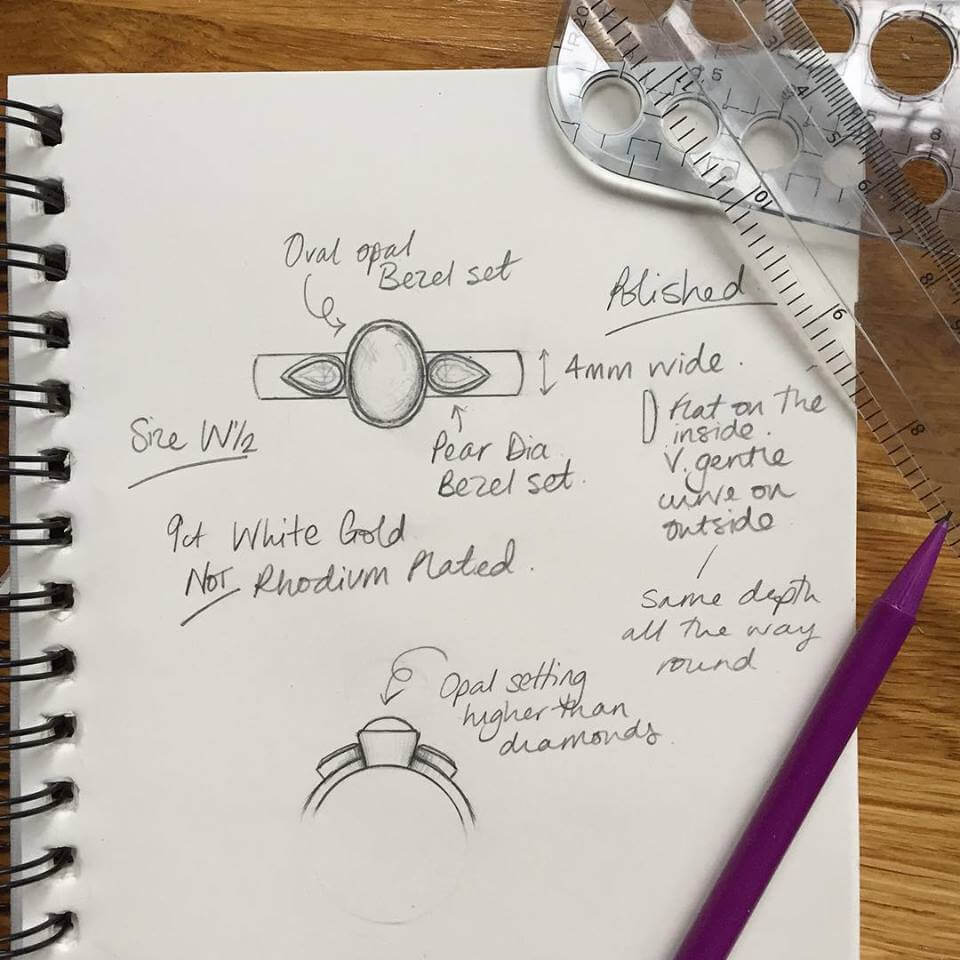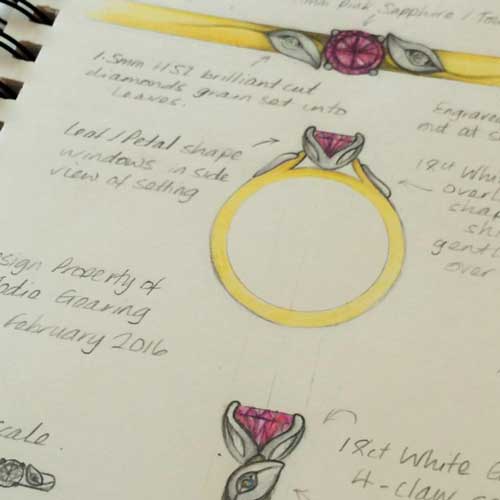 Going through the bespoke jewellery design journey is a fantastic and exciting process. You will be working with an expert who can answer any questions you have – you’ll get to learn in more depth about the purchase you are making than if you bought a ring off the shelf. Seeing your ideas translated into a beautiful design on paper and then be made into a stunning and unique ring is a truly magical experience that will only add to the joy at this exciting time.