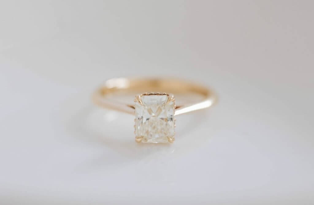 I selected a range of radiant cut diamonds within budget for this bespoke engagement ring and the couple hand selected their favourite based on how it was in the flesh rather than the details on a certificate as you would just buying a diamond online. This beautiful stone is actually a lower colour than average but this is balanced out with immense sparkle as it is so well cut. Set in yellow gold, it looks brilliant white.