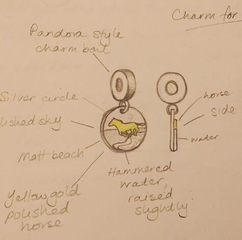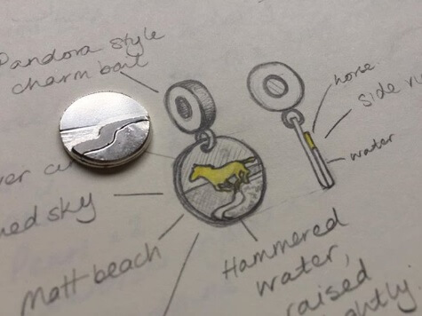 We discussed some ideas over the phone and then I set to work drawing up my interpretation of the brief, which I emailed over to David. The design consisted of a round disk of silver with a polished sky and a textured area from the horizon down to represent the beach. The water is depicted with a hammered layer of silver which sits on top of the sand. The silhouette of a running horse takes pride of place in the centre. I initially designed it with a yellow gold horse so the colour contrasted with the silver, but we switched it for rose gold once David had taken a look at the sketch.