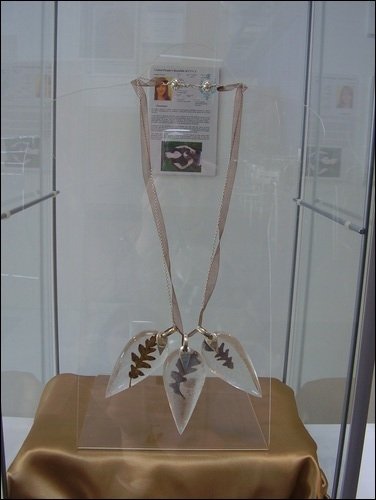 Made as my final piece of my Foundation Course at Canterbury using layered, shaped and polished Perspex, rolled silver leaves, a real oak leaf, silver chain and a hand crafted silver clasp and beads.