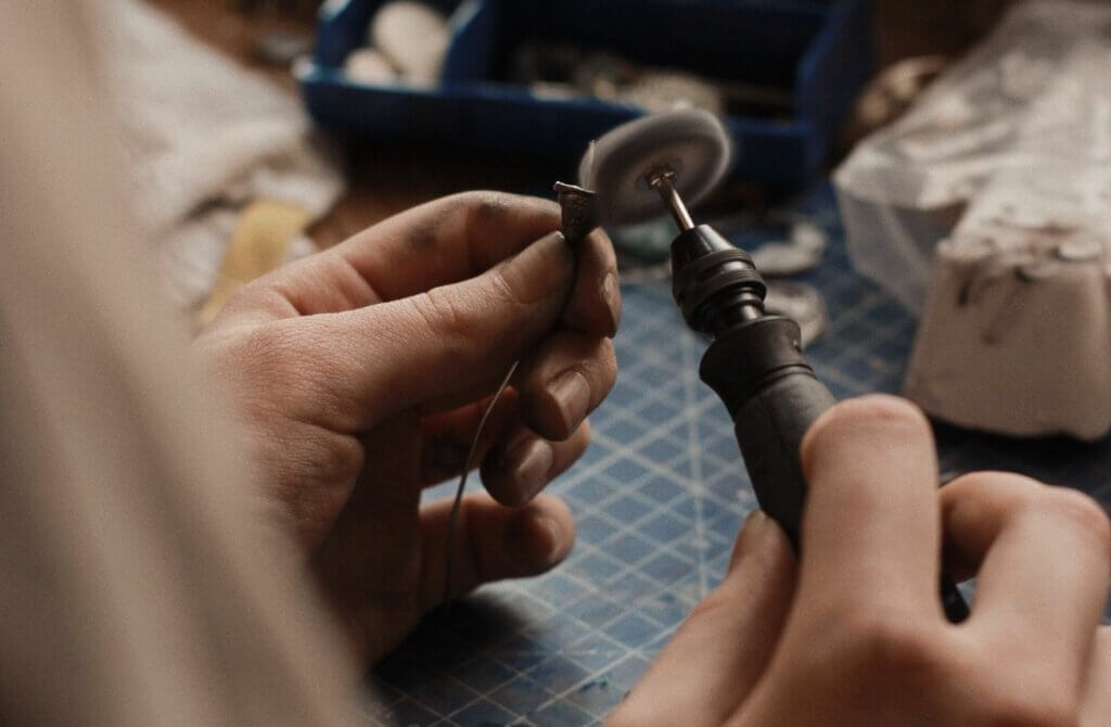 Plating is a process used to change the colour of precious metal. To plate a piece of jewellery, it is first cleaned up to remove any residue that could stop the rhodium from fusing with the metal. An electrical current is then run through the piece of jewellery while it is suspended in a plating solution. Tiny particles of rhodium will attach to the surface of the metal and produce a bright, cold white colour. Traditionally, this plating is put over white gold to give it the bright white colour of Platinum. The plating is normally around 0.75 to 1.0 microns thick. Any thicker and it can crack due to rhodium’s inherent brittleness, and any thinner and it will wear away very quickly.