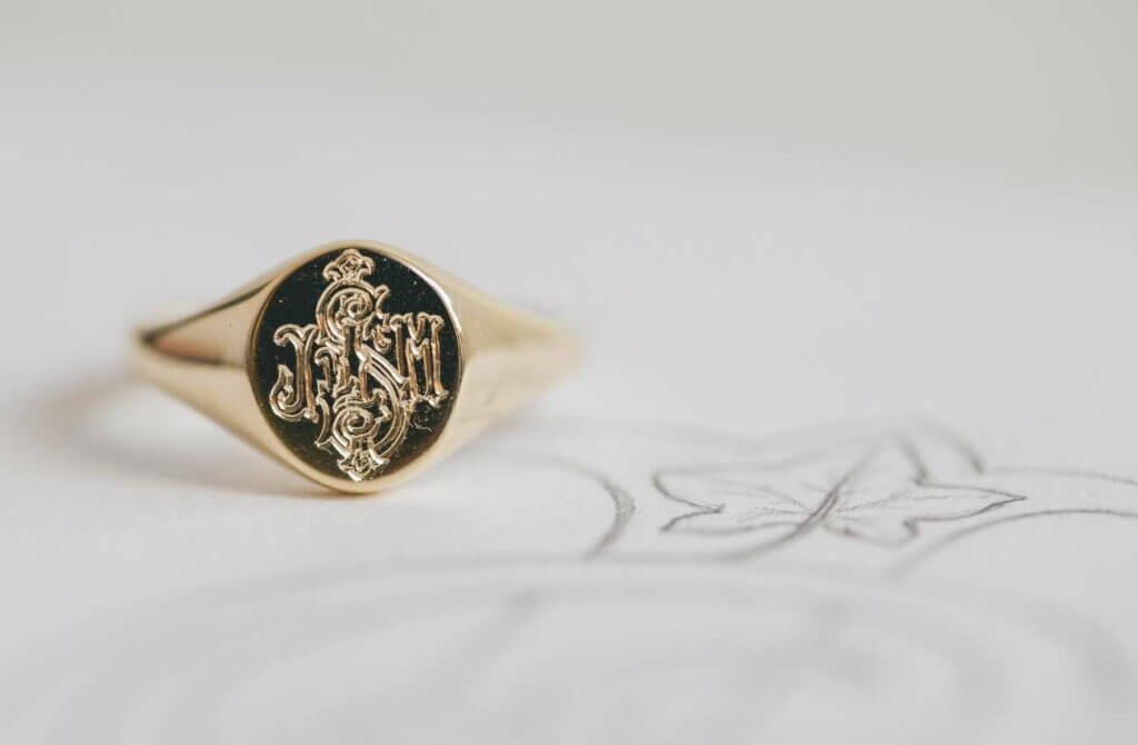 Look closely at the wedding ring above and you will see that the inside of the wishbone shaped band is a richer yellow tone. This is because Emma wanted to use her beloved Aunt’s wedding ring for her own, but the colour did not match the 18ct yellow gold of her engagment ring. We lined her bespoke wedding ring with the sentimental gold to keep her Aunt’s memory close, whilst matching her engagement ring on the outside.