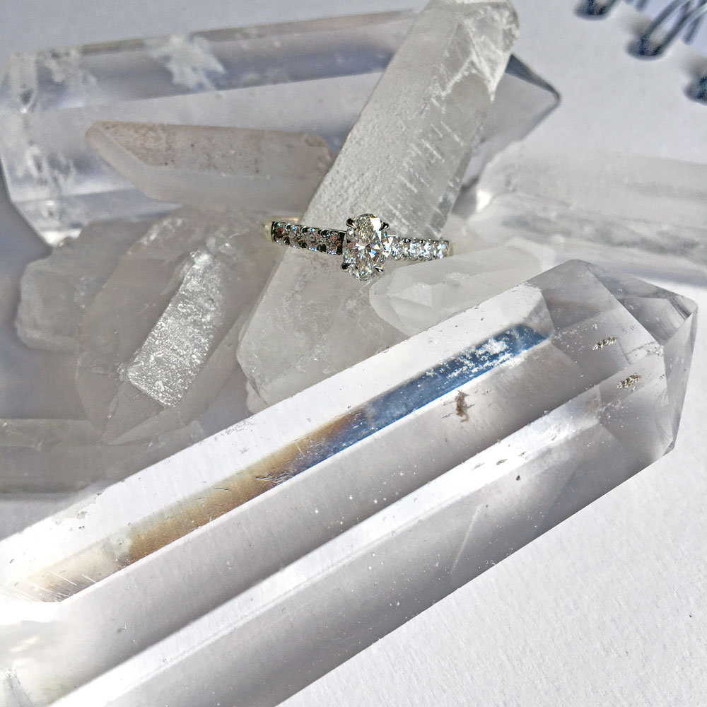Tom designed this oval diamond engagement ring with diamonds in the shoulders for Jordan