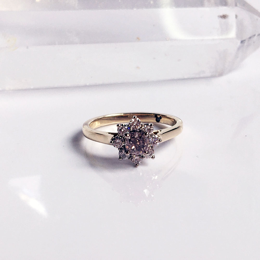 A natural pink cushion shaped diamond in a cluster style engagement ring surrounded by brilliant cut white diamonds.