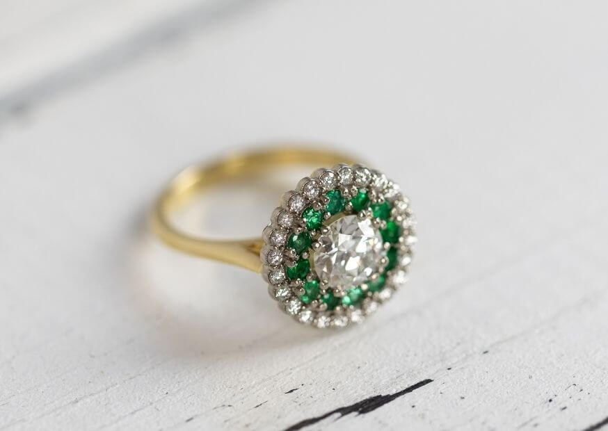 Clusters are similar to halos in that the central stone is surrounded by more stones (usually diamonds) but they are individually set rather than grain set into a metal plate. The surrounding stones tend to be bigger than those found in a halo ring.