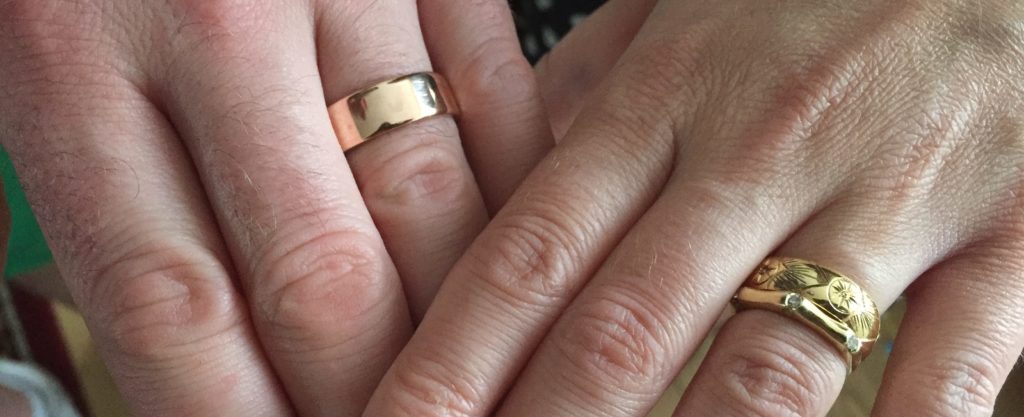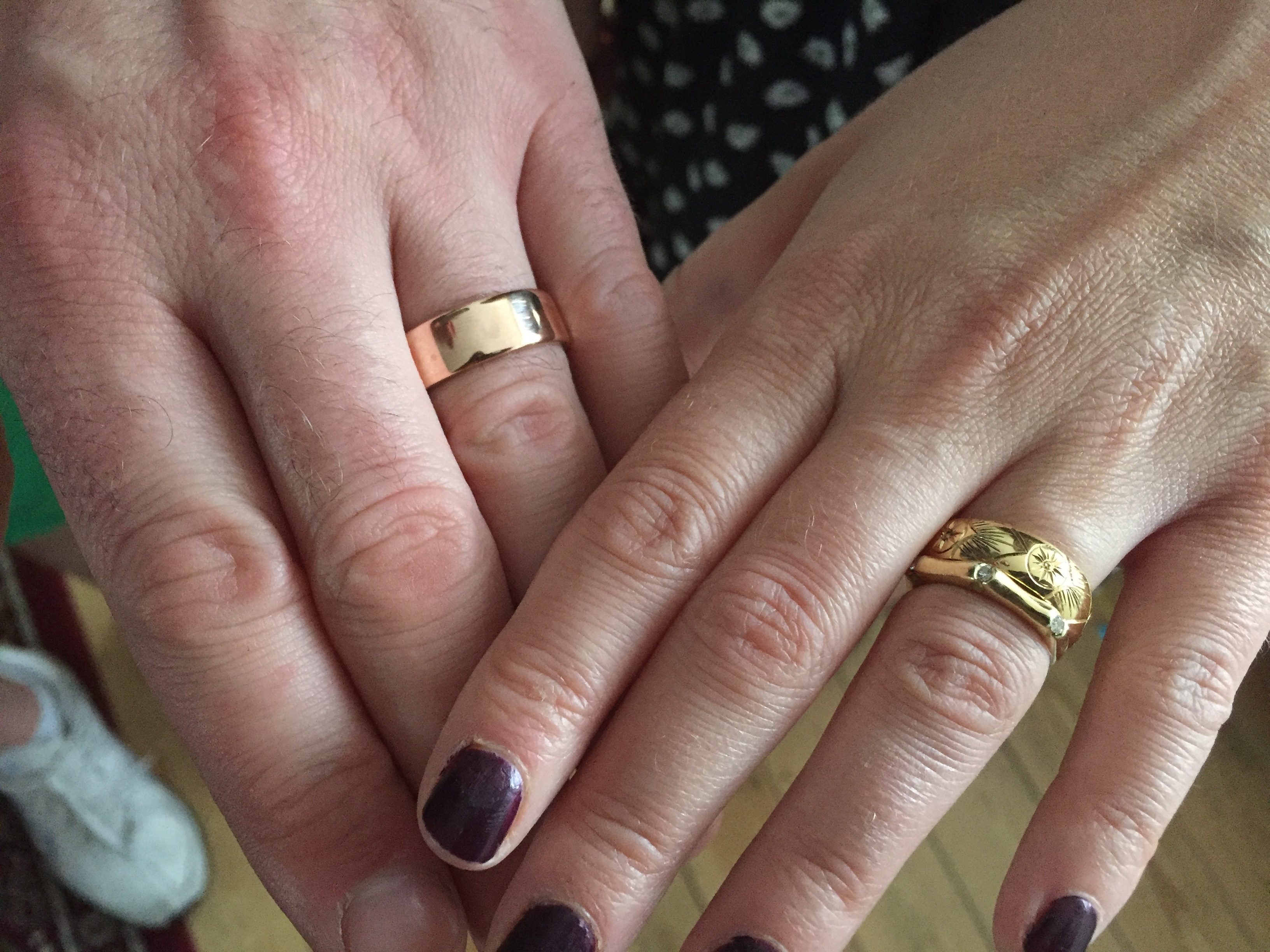 Even my own husband’s wedding ring does not fully match mine – his is a mixed metal band of 18ct white gold and 9ct rose gold, which happens to be our favourite gold colour combinations. My wedding ring is just 18ct white gold but with a splattering of white diamonds. He wasn’t keen to match those…