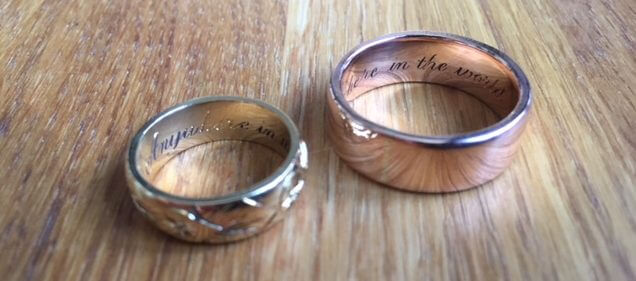 Design features to consider can include engraving, adding a texture or special finish, or setting gemstones into the surface of the ring. Engraving and flush set gemstones can be hidden inside the ring should you wish to have something personal between you and your partner. Here are some examples for inspiration: