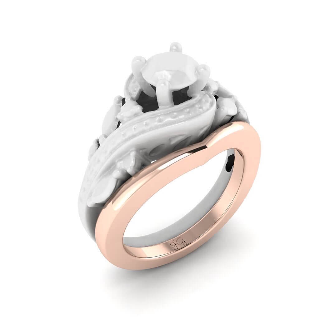 The wedding ring deepens towards the front to balance with the heavy engagement ring and to help stop any potential spinning.