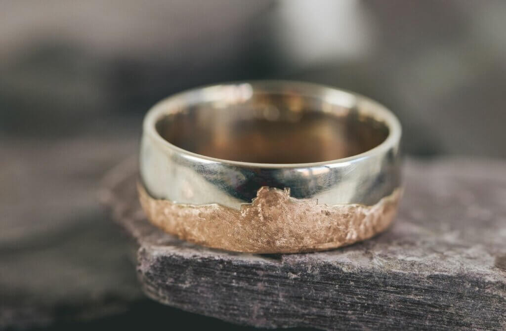 The rose gold half of the ring is in this silhouette, with a brushed finish to capture the earthy, rugged landscape. We made sure to include the silhouette of Auchindoun castle, which is very special to the couple. The sky itself is depicted in natural, unplated, polished white gold to contrast the rose gold landscape.