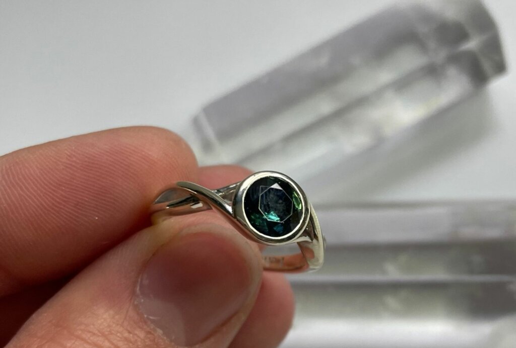 Caroline and John sourced their own teal sapphire, which became the centrepiece for this organic twist style ring. The stone sparkle with yellow, blue, green, turquoise and teal flashes as it moves with the wearer.