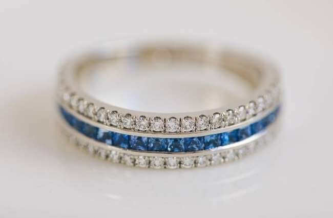Cornflower blue princess cut sapphires in the central channel setting of this sparkly eternity ring
