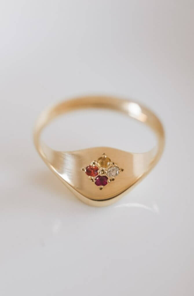 I recently surprised my husband Marc with this signet ring to represent our family. The outside is hand engraved with a monogram of our initials, and inside the signet head are our family birthstones. I am represented by the diamond (April), and the ruby (July) and citrine (November) represent our daughters. For his September birthday, I chose an orange sapphire to complete the autumnal colour palette and to represent my auburn haired husband!