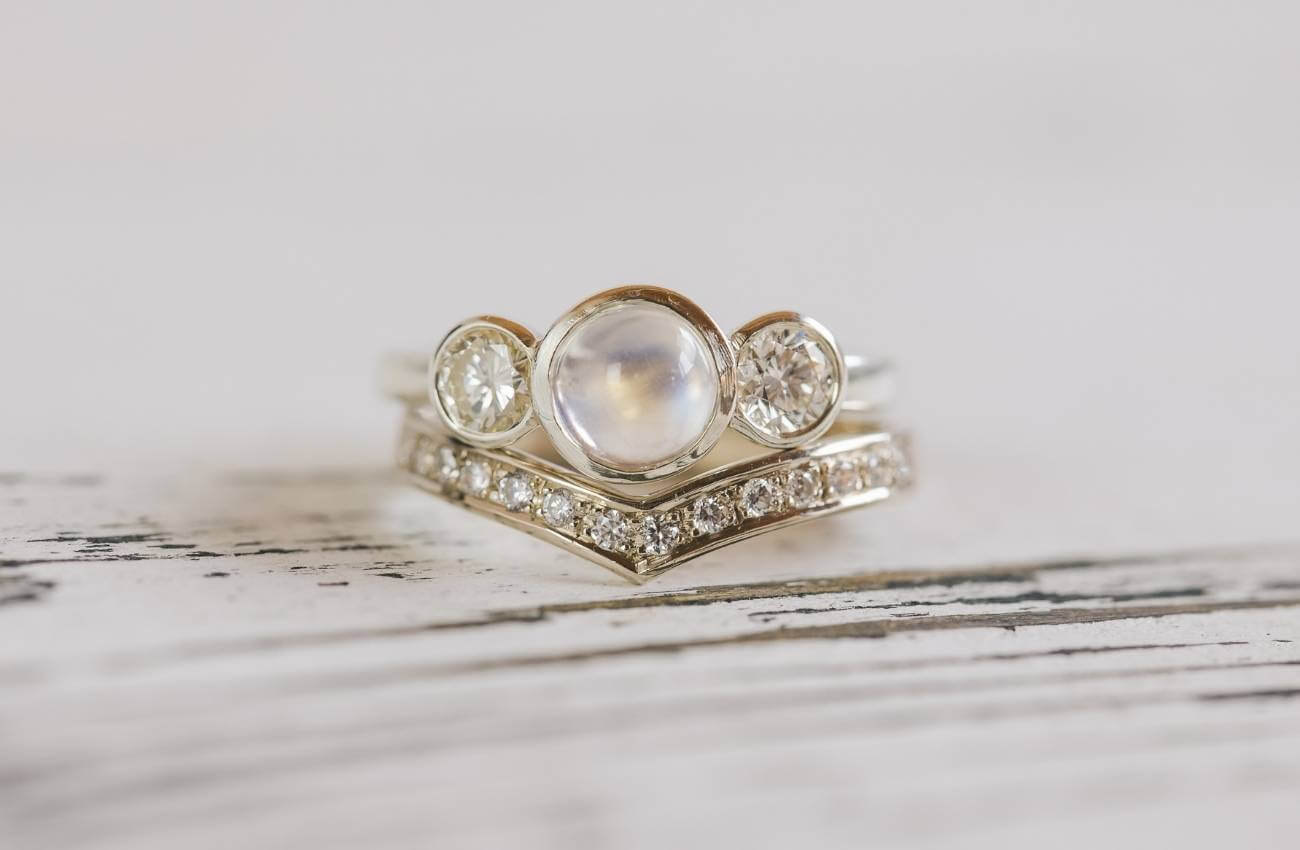 Similarly, in this diamond and moonstone engagement ring, there is a slight contrast between the white of the diamonds and the warmth of the white tone of the metal. If this ring had been made in Platinum or rhodium plated white gold, the metal and the diamonds would have the same bright white look, creating an all over sparkly effect, which does work for some designs, but in this case, the softer colour worked better.