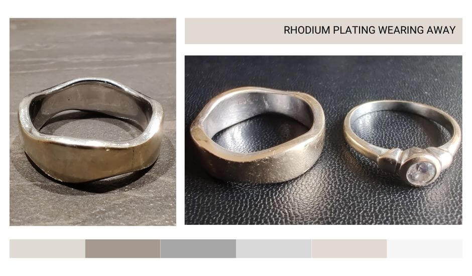 Therefore any colour change is not tarnish, but the true colour of the white gold showing through the plating in patches. Next to the bright, cool white of rhodium, these patches will look more yellow than they really are.
